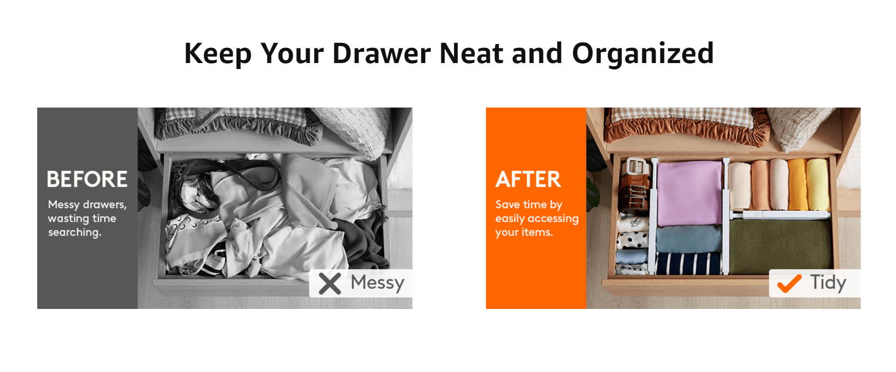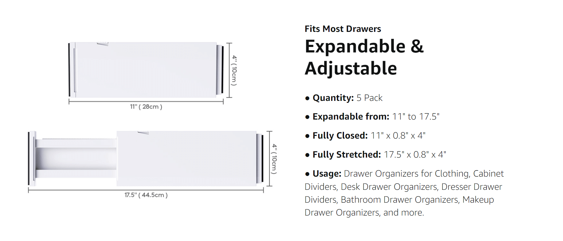 • Expandable & Adjustable: Our dividers are adjustable to fit most drawers and cabinets, ensuring organized and tidy storage.