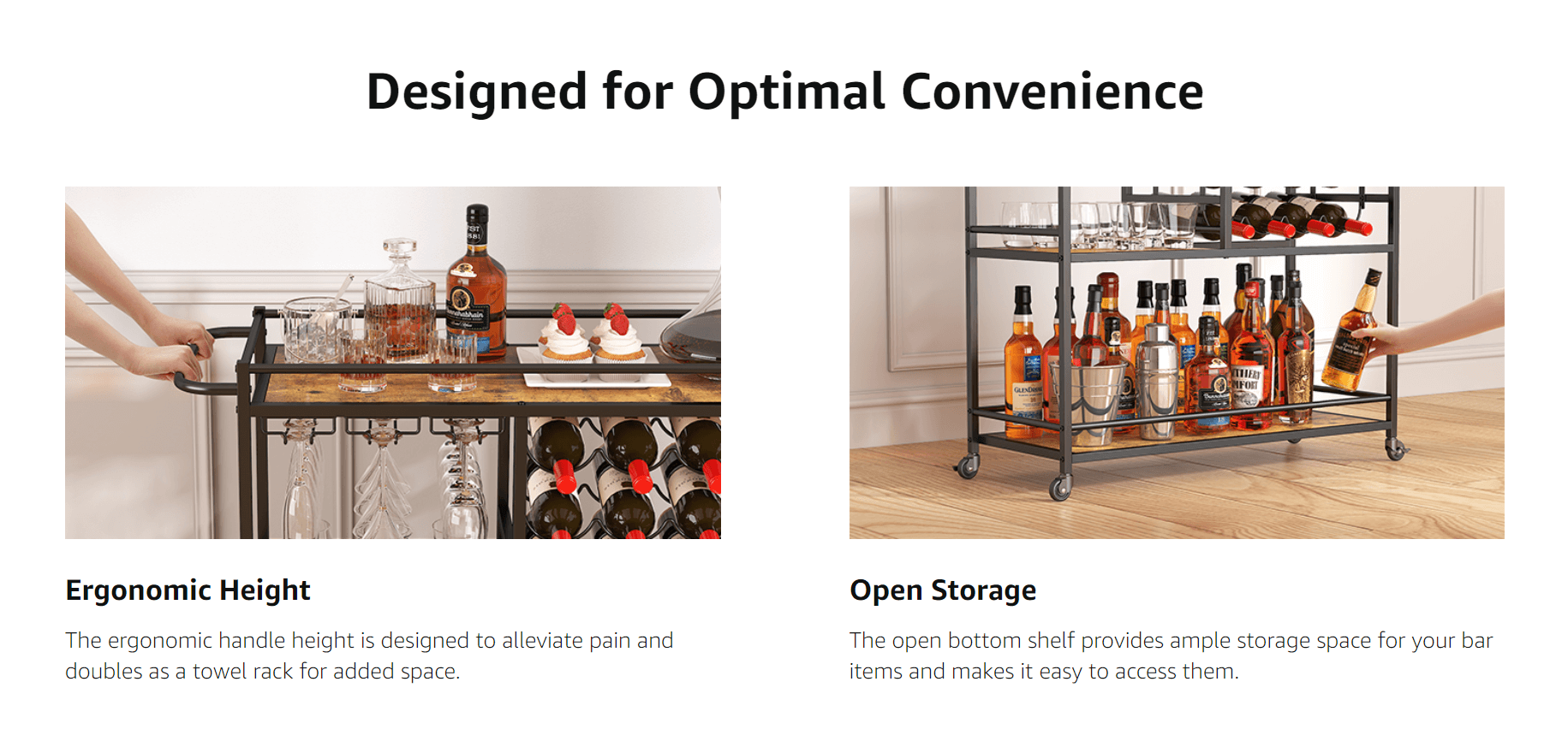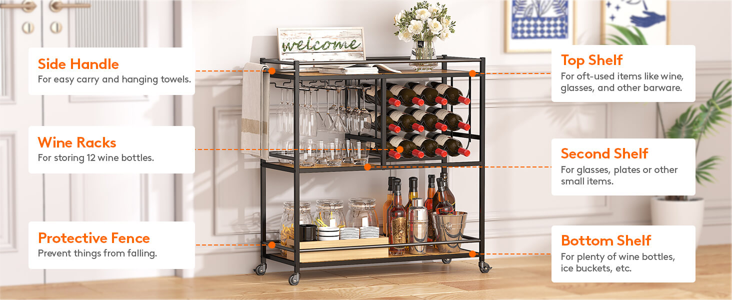Large Storage Space: Display all your happy hour essentials with 3 shelves, 12 bottle racks, and 3 rows of glass holders.